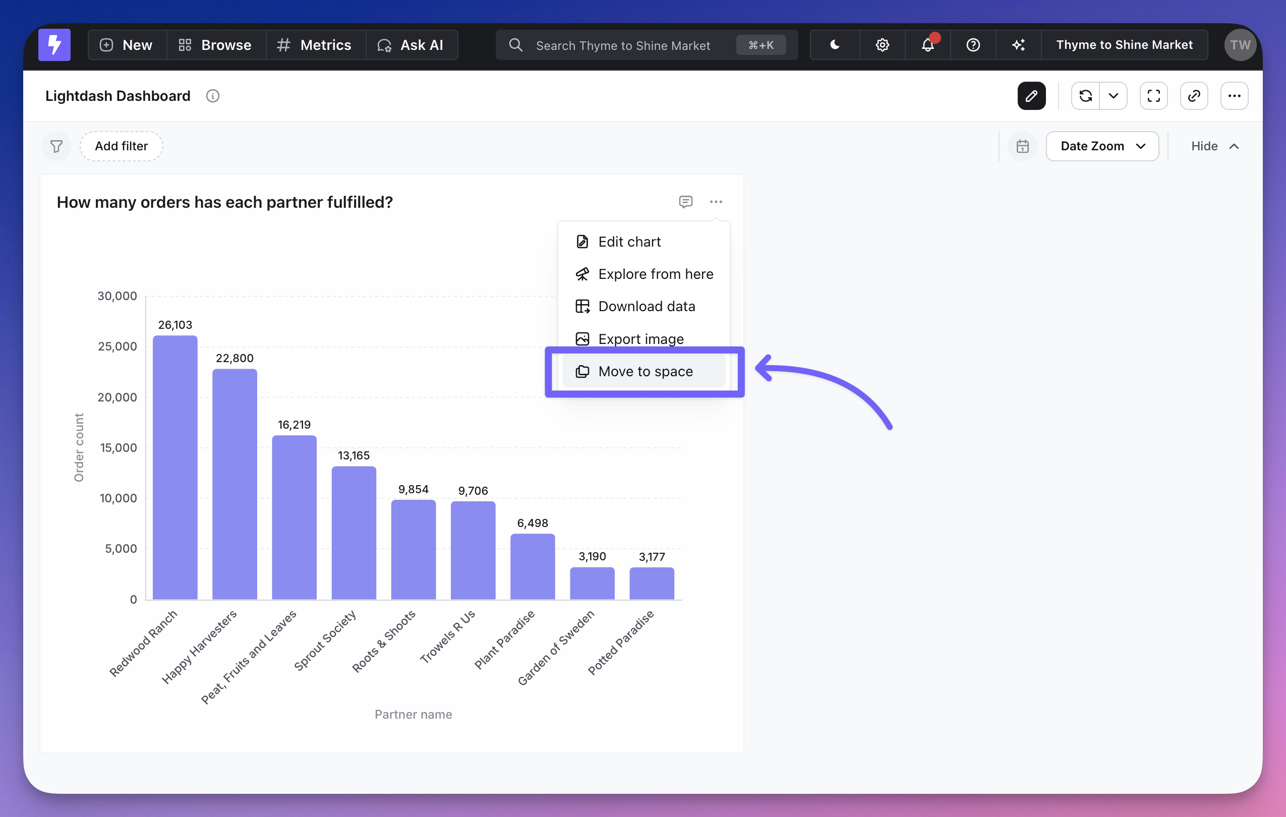 Note: These charts can’t be used in other dashboards and won’t be shown in the global search or in any space. If you want to make these charts reusable in other dashboards, you can detatch them from the dashboard and save them to a space so they’re permanent using the move to space option from the chart’s three-dot-menu.