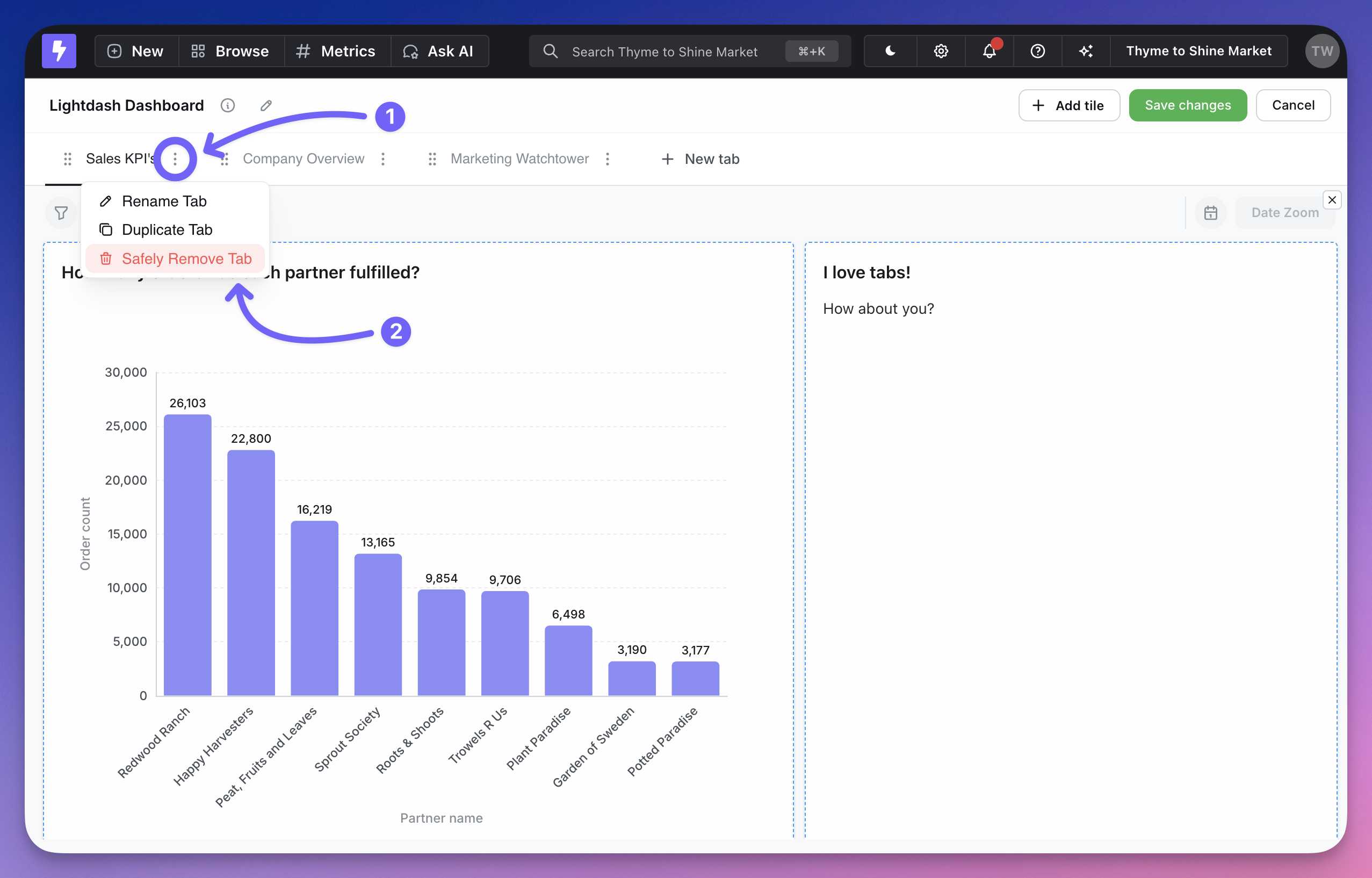 To edit a tab, click on the edit icon to the right of your tab name while in dashboard edit mode. You can either rename or remove the tab from your dashboard.