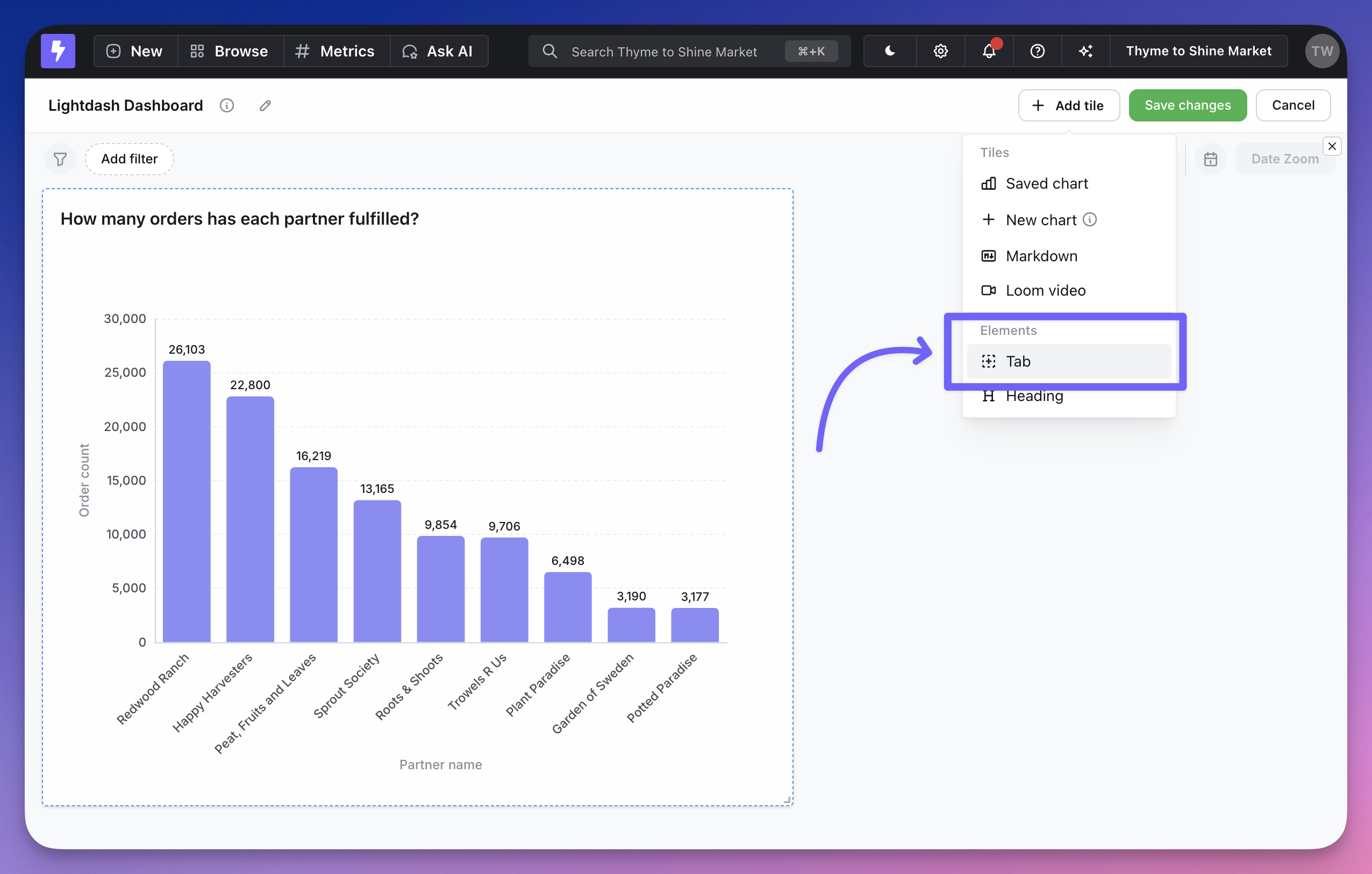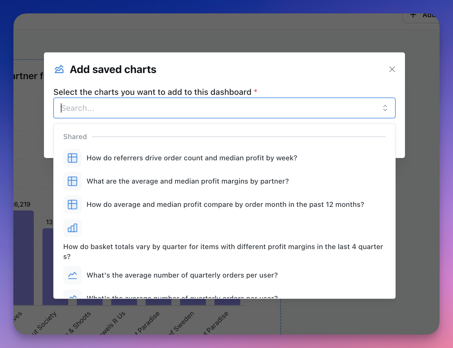 You can add an existing chart to your dashboard by clicking “Add tile” and then “Saved chart”. Clicking any chart will add it at the bottom of your dashboard.