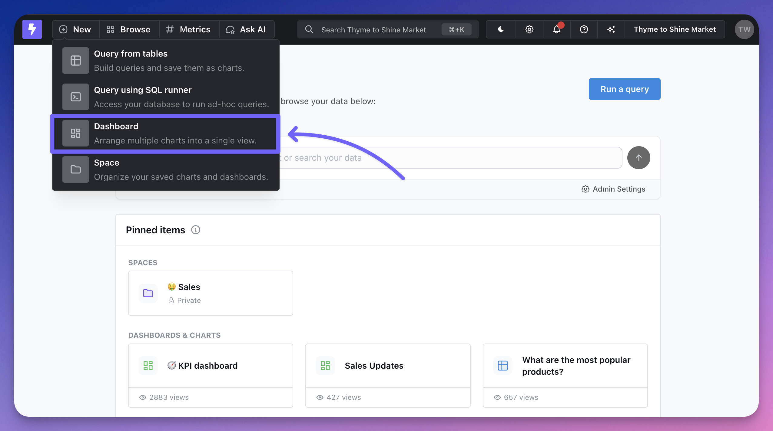 Dashboards allow you to arrange multiple charts that are related to each other into a single view. The process for creating dashboards is as follows: