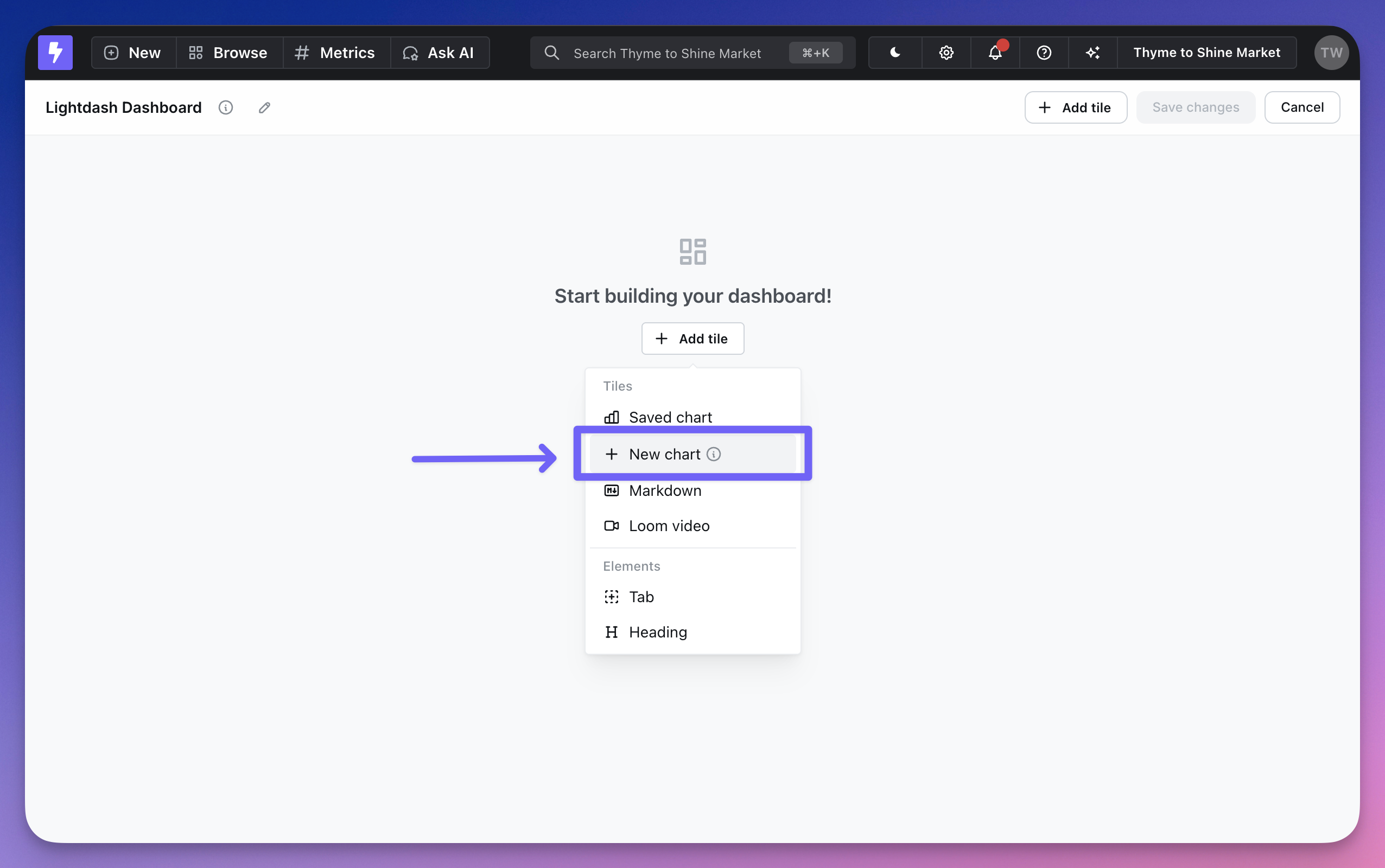 Creating charts from within a dashboard helps to keep your spaces and projects clutter-free from charts that are used only once in a dashboard. Charts that are created from within your dashboard are exclusive to the dashboard. This means that they can’t be reused in other dashboards in your project. Click “Add tile” and then “New chart” to create a chart that is exclusive to the dashboard. You will be taken to the chart builder. Once you save the chart it will appear at the bottom of your dashboard.