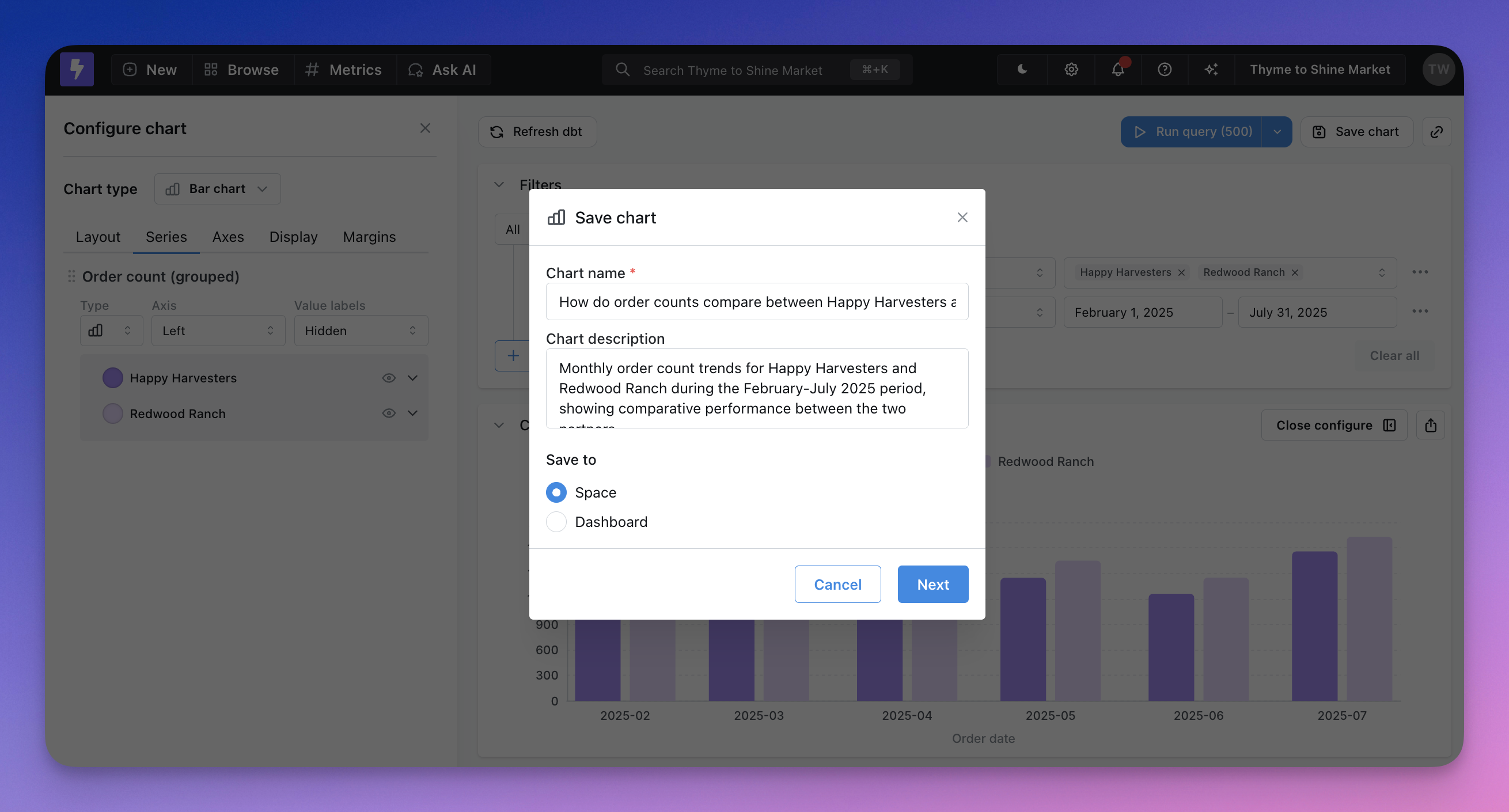 To save a chart, click the Save chart button at the top of the page, then give your chart a useful name and description. You’ll have the option to save the chart to a Dashboard or a Space. Once you save a chart, it unlocks these useful features: