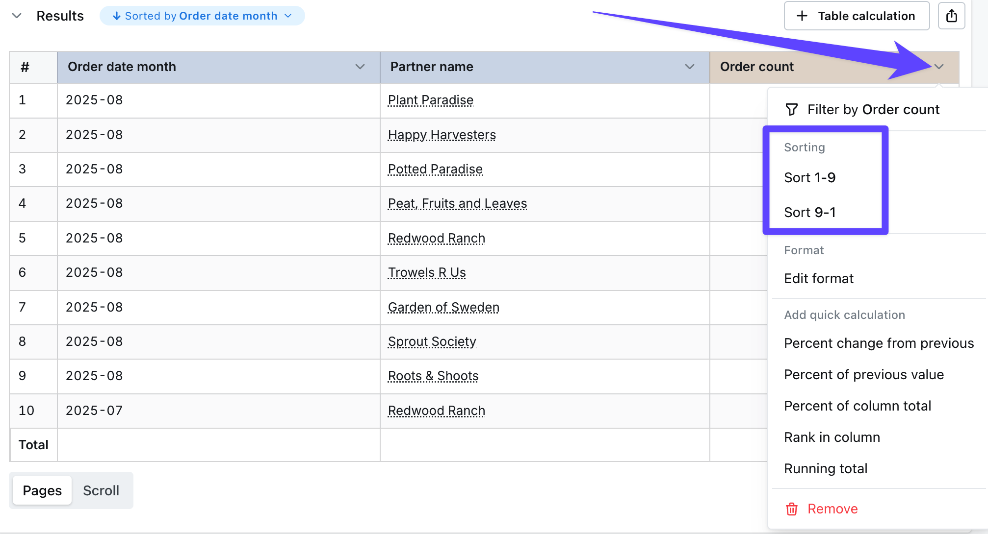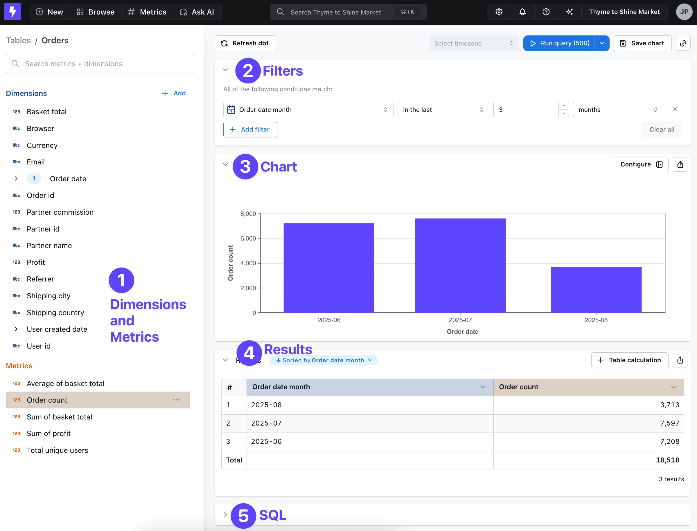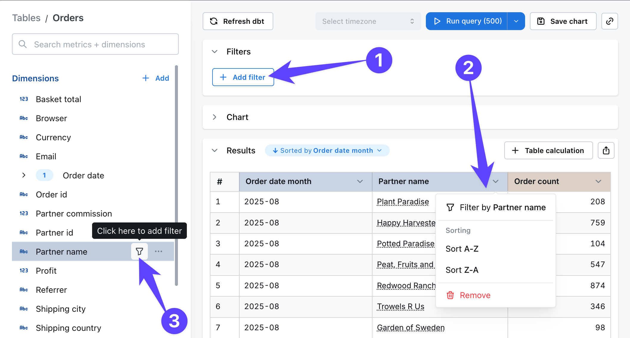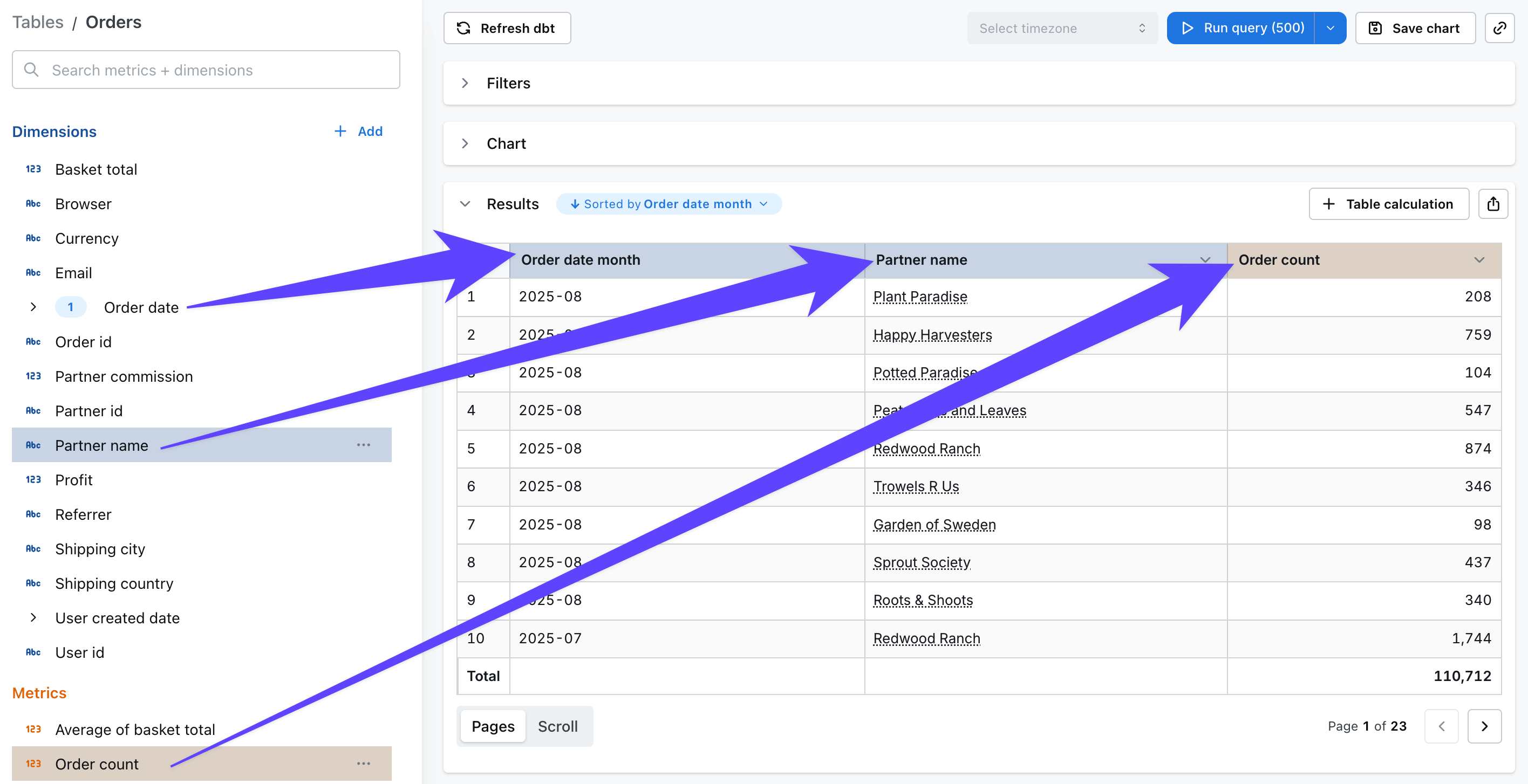 For example, if I wanted to know the “number of orders per month split by partner”, I’d select the Order count metric, the Order month dimension, and the Partner name dimension, to split by partner.