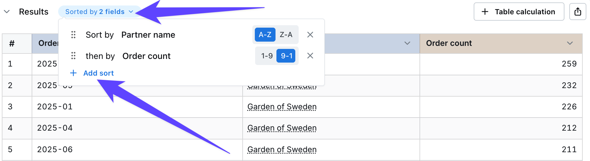 If you want to sort by multiple fields, click the blue pill that displays the current sort, then choose + Add sort.