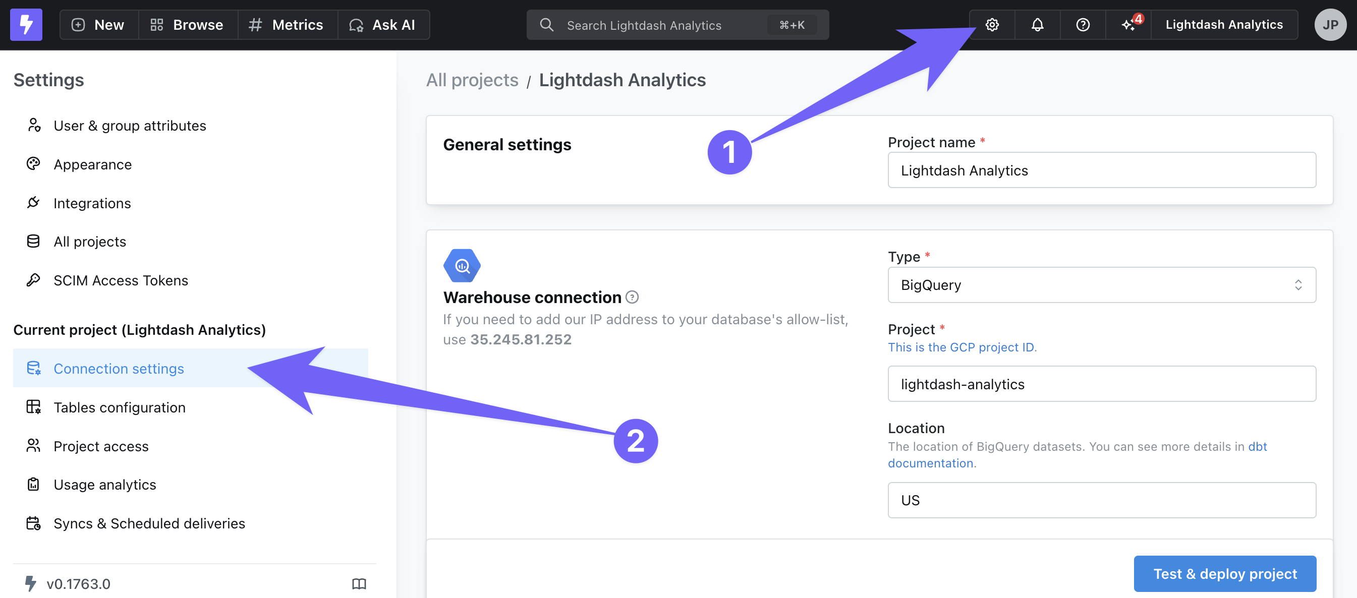To update an existing connection, go to Project settings by clicking on the gear icon in the top-right navigation.