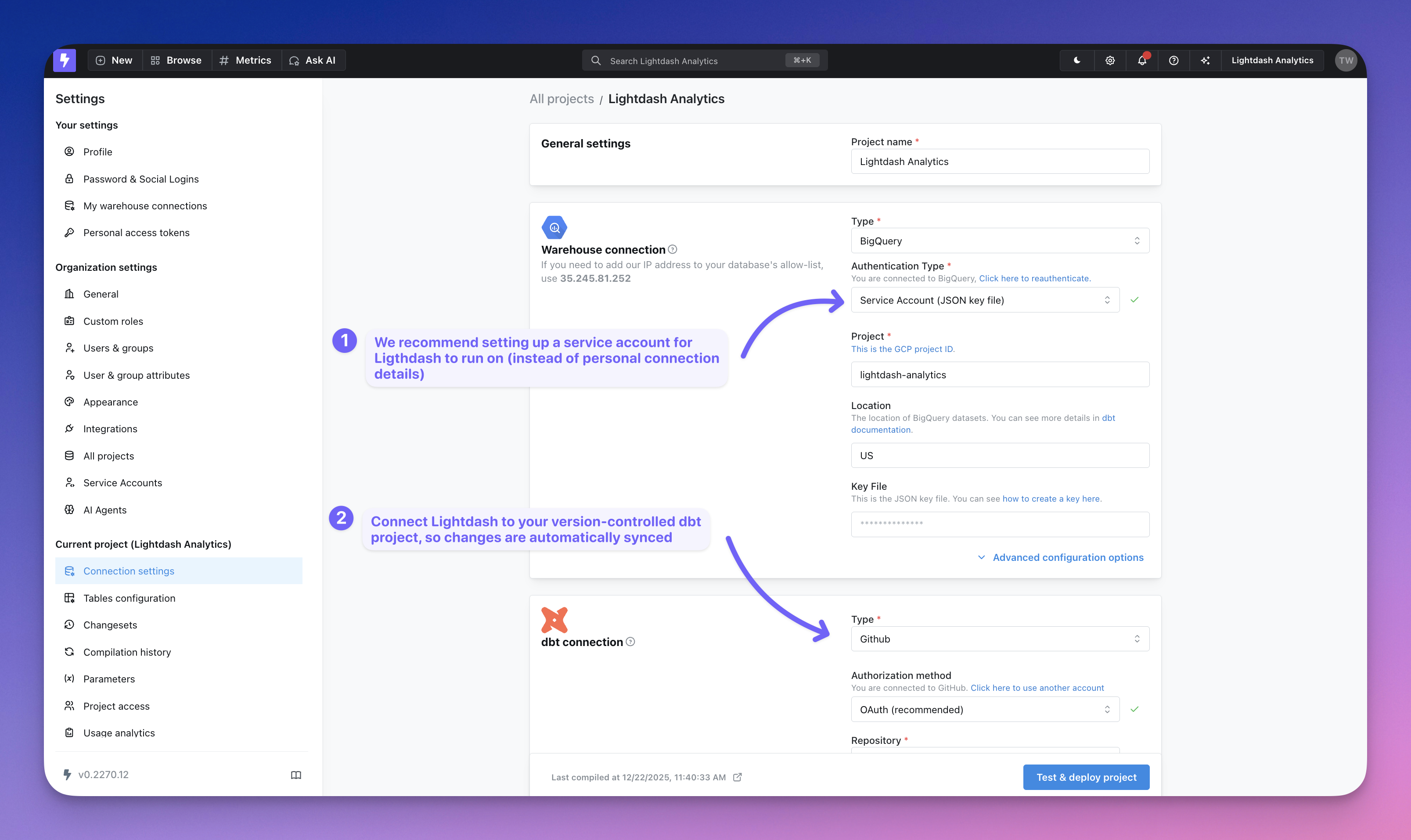 - Set up a service account for Lightdash to run on (instead of using your personal connection details)