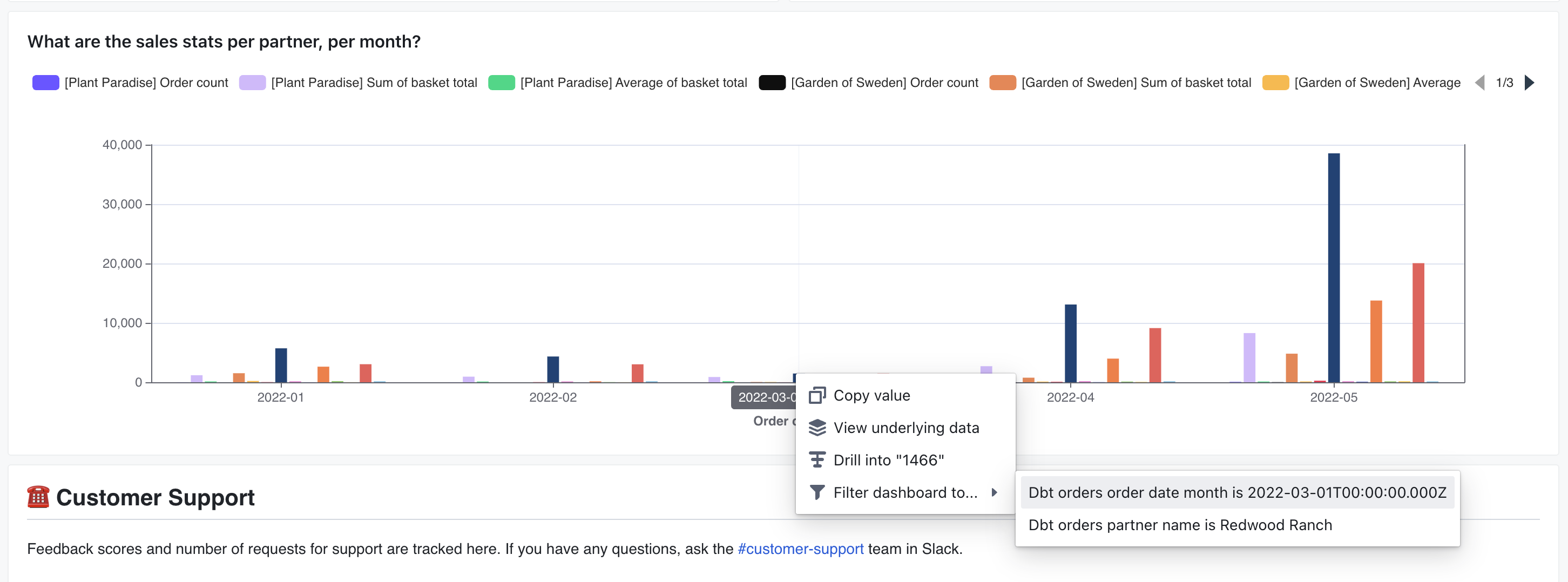 I have a chart with Sum of basket total (a Metric) per Partner, per month. As you can see, there’s a high spike in sales for one of the partners in the month of May. I want to understand why this spike happened. To do this, I click on the data point in my chart, then click Drill into in the action menu:
