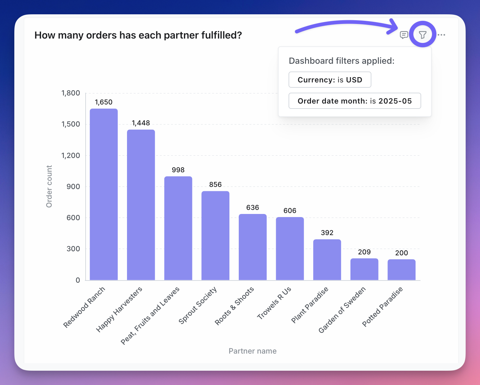 Once you’ve clicked on your filter, all of the tiles in your dashboard with the filter field will be filtered to the value you selected. You can see which tiles had the filter applied by hovering over the tile and then on the funnel icon to see the filter that was applied.