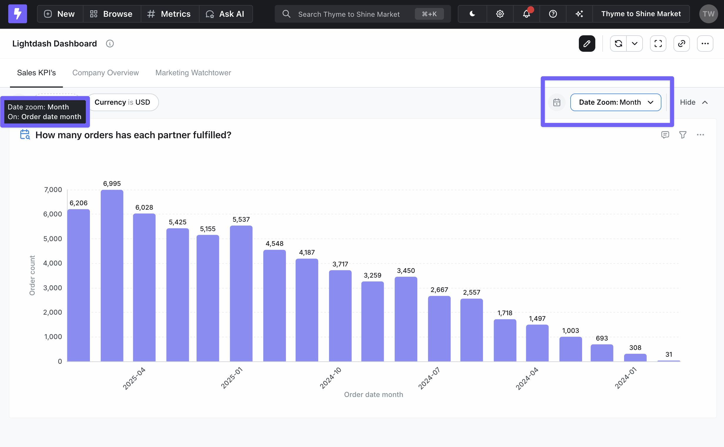 When viewing a dashboard, you can change the date granularity (to Week, Year, etc.) of the charts with date dimensions by clicking on the Date Zoom button. This is helpful if you want to zoom in to look more closely at something, or zoom out to identify a trend. You’re able to quickly view your results at different time granularities without editing the chart. Here’s a quick video showing Date Zoom in action: When the date granularity of a chart is changed, you can hover over the indicator to see the date dimension that was affected: