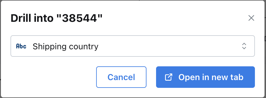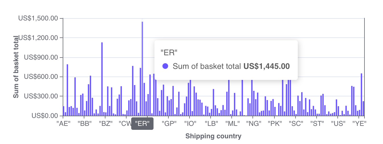 Once I’ve selected the Dimension I want to group by, I click Open in new tab and see a chart with my Metric, grouped by Shipping country. Now I can uncover where this spike in sales is coming from