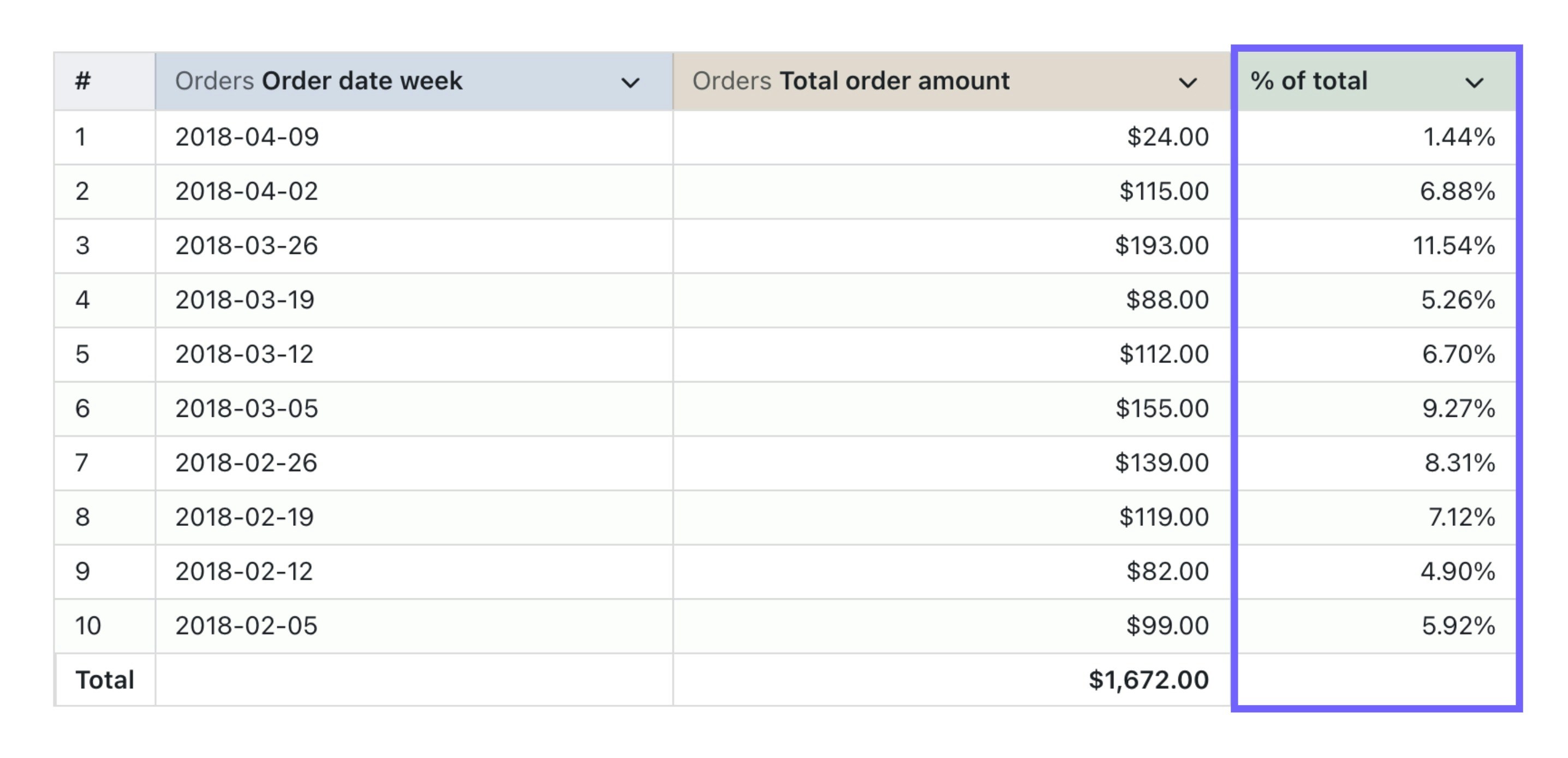Just gimme the code! Here’s an example of a percent of the total column: