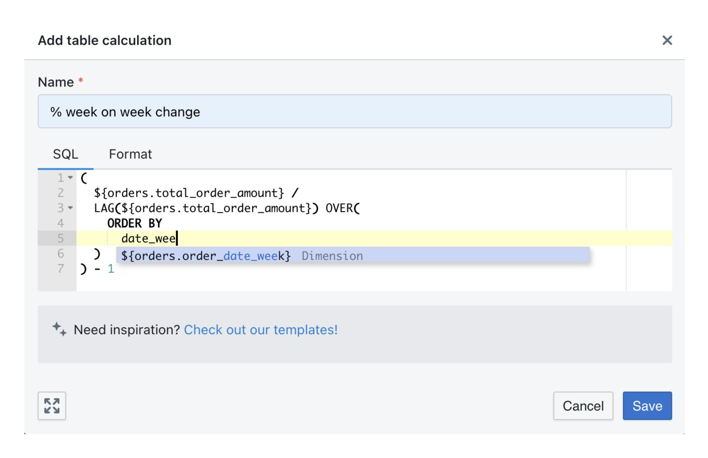 Your table calculation is defined using raw SQL that you write up in this pop up box. If you’re not sure what to write here, you can check out some of our table calculation SQL templates. To reference the metrics and dimensions in your results table, you can either use the autocomplete, or you can manually write the full field name using the format ${table_name.field_name}.