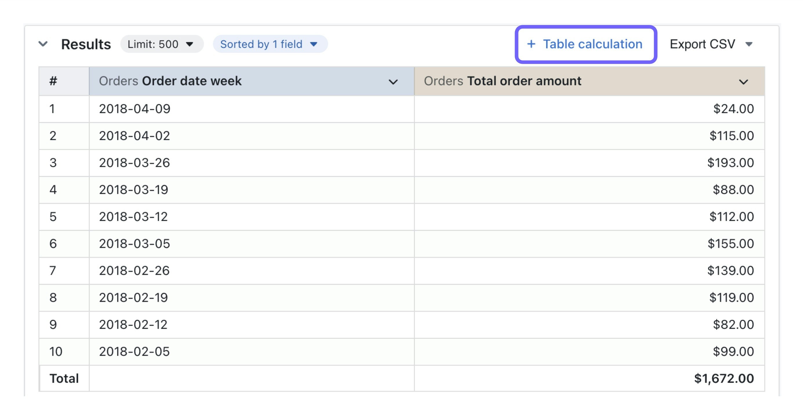 Once you’ve got some data in your results table, you can create a table calculation by clicking on the + Table calculation in the Results tab of the Explore view: