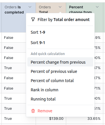To learn more about what these calculations are doing, check out the docs here. Once the table calculation is generated you can edit it to modify the SQL query or update the format.